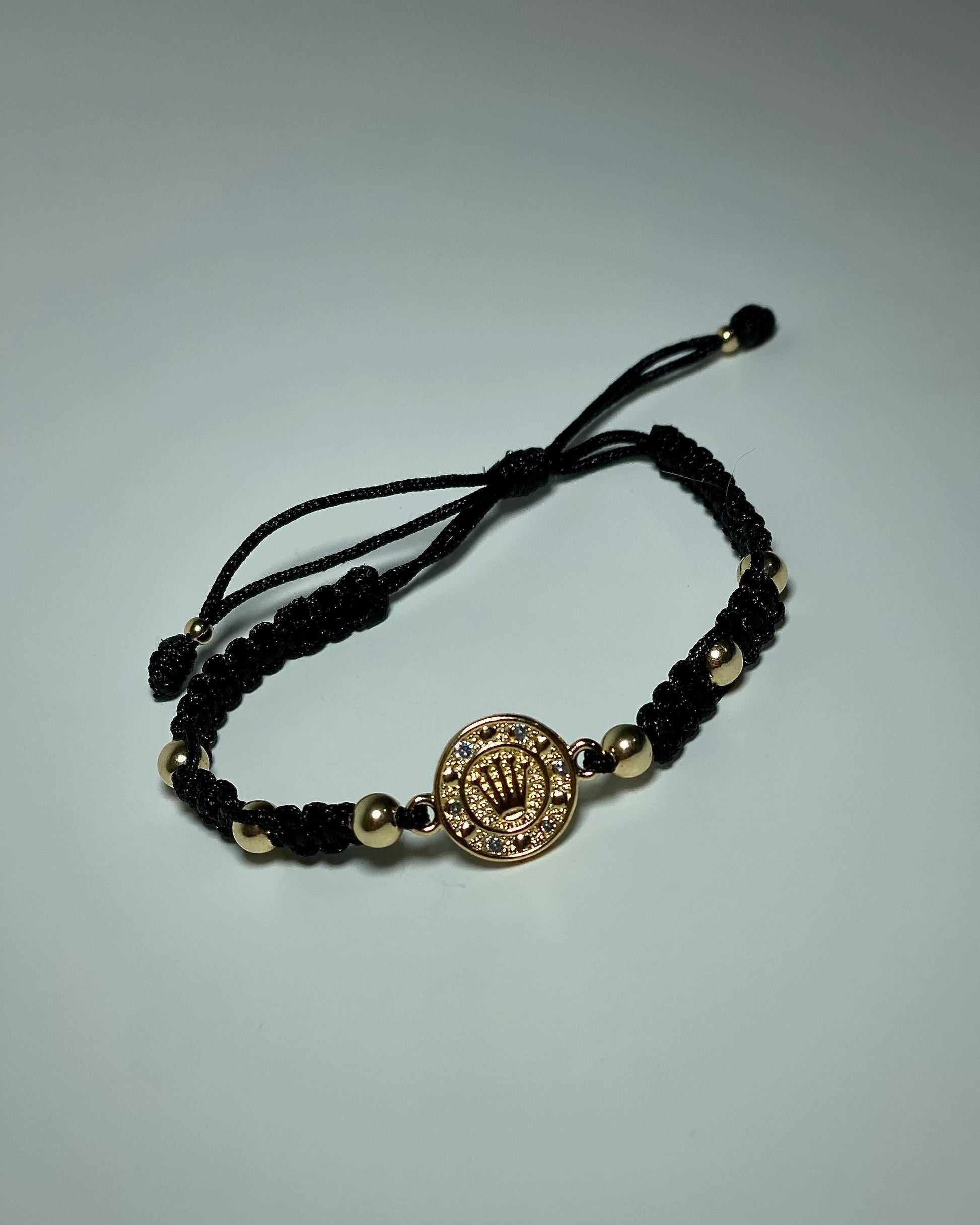 Pulsera tejida a mano con diseño elegante y significativo. Al centro, destaca un herraje de corona de 2 cm en oro laminado, sÃmbolo de liderazgo y estilo. Acompañada por 6 bambalinas lisas de 5 mm, también en oro laminado, que aportan un acabado moderno y sofisticado.