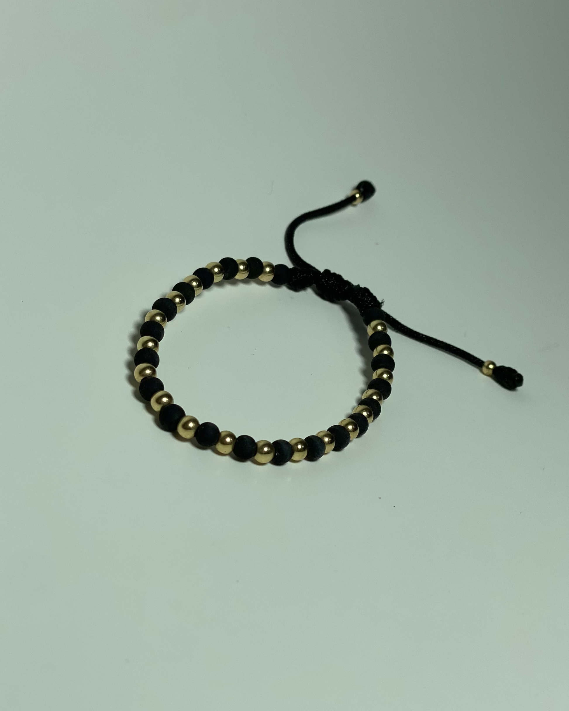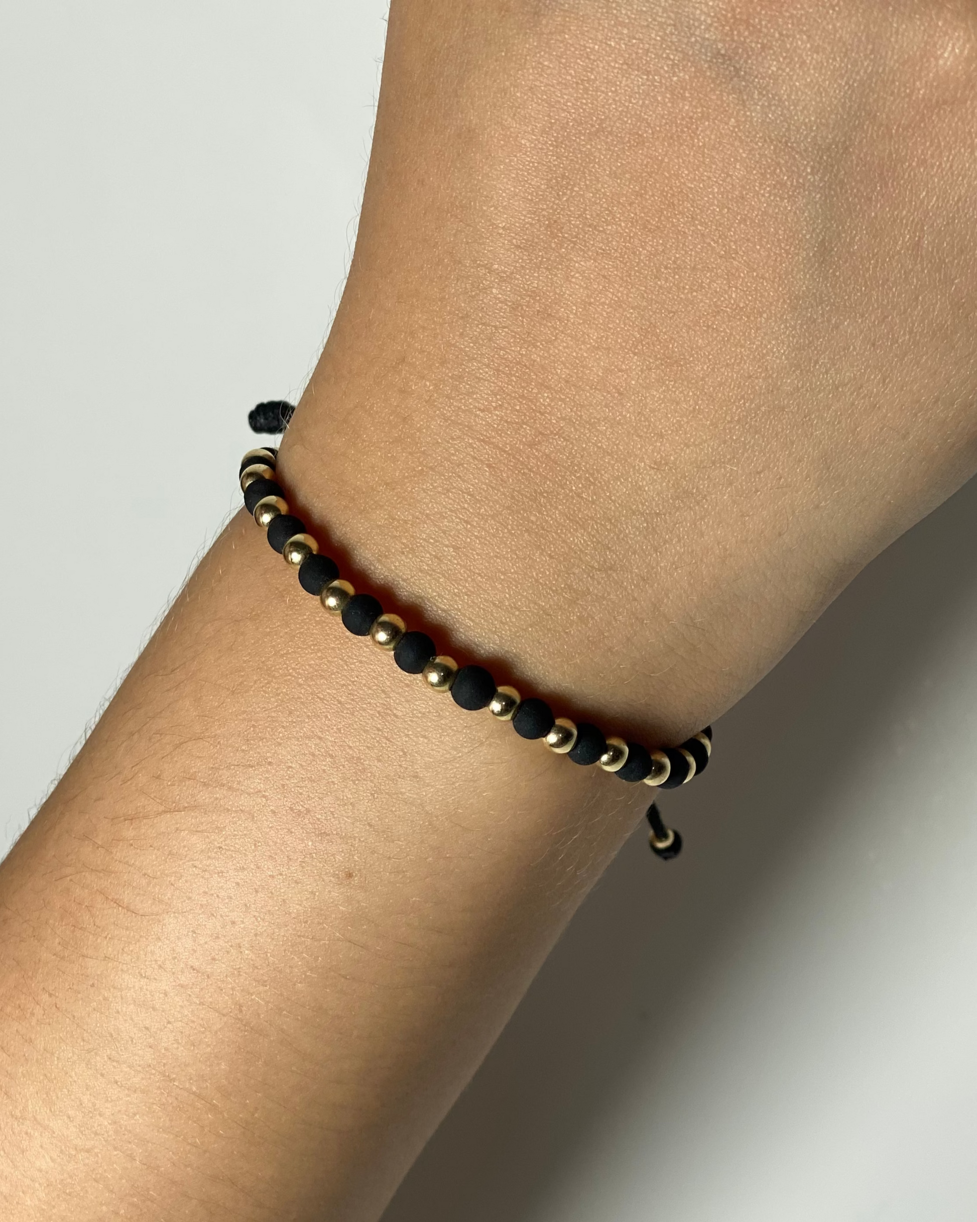 Pulsera tejida a mano con diseño moderno y versátil. Combina bambalinas lisas de 4 mm en oro laminado intercaladas con neopreno de 6 mm, creando un contraste elegante entre brillo y textura.